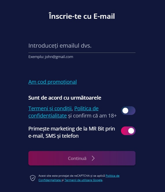În acest moment, nu este necesar să introduci un cod promo la înregistrarea pe platforma mrbit.ro, pentru a activa oferta de bun venit.
